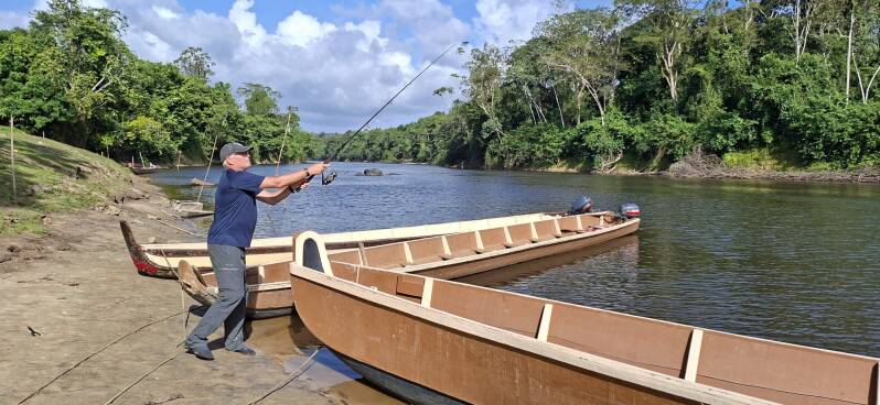 Vanochtend om 9.00 uur zaten Harm en ik voor de Ipad. De uitvaart van mijn vader konden we met een livestream volgen. Alles leek goed te gaan, maar de verbinding kwam niet tot stand. Achteraf viel dit volledig te verwijten aan een ongelooflijk amateurisme bij de locatie die de uitvaart verzorgde. IK was zo boos, maar inmiddels heb ik het boek gesloten. Er is een kapitale fout gemaakt door de verbinding niet vooraf te testen. En ook de beloofde registratie (download) is niet gerealiseerd. Gelukkig heeft mijn vrouw nog wat gefilmd met haar telefoon en heb ik mijn zonen uitvoerig kunnen spreken. Het is goed zo. Het is niet meer terug te draaien, maar ik neem het de uitvaartmaatschappij enorm kwalijk voor deze grove blunder. Al met al een wat moeizame dag die gelukkig werd afgesloten met iets leuks. IK mocht twee uurtjes vissen op piranha’s. Gewoon hier in de rivier. IK kreeg wel een medewerker mee om de vissen te onthaken, want 1 verkeerde beweging en je ben vier vingers kwijt. Al bij de eerste ingooi ving ik een exemplaar van 5 kilo. De schrik sloeg om mijn hart toen ik ineens een kaaiman tevoorschijn zag komen. DIe had de dag van z’n leven, want van de vier piranha’s die ik heb gevangen, zijn er twee gevoerd aan de kaaiman. Het was een geweldige ervaring en een mooi slot van deze vreemde dag.
